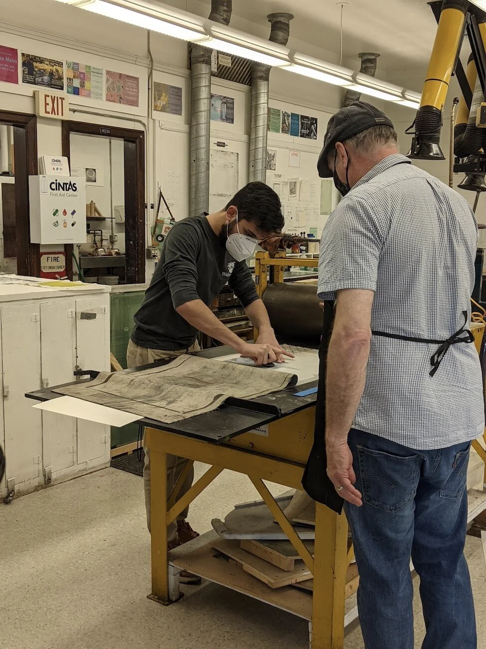Jim juggles screenprinting and assisting the students. There is an issue with transferring images onto the blocks - the citrus stripper doesn’t seem to be working properly. Jim and Jason work together to troubleshoot.