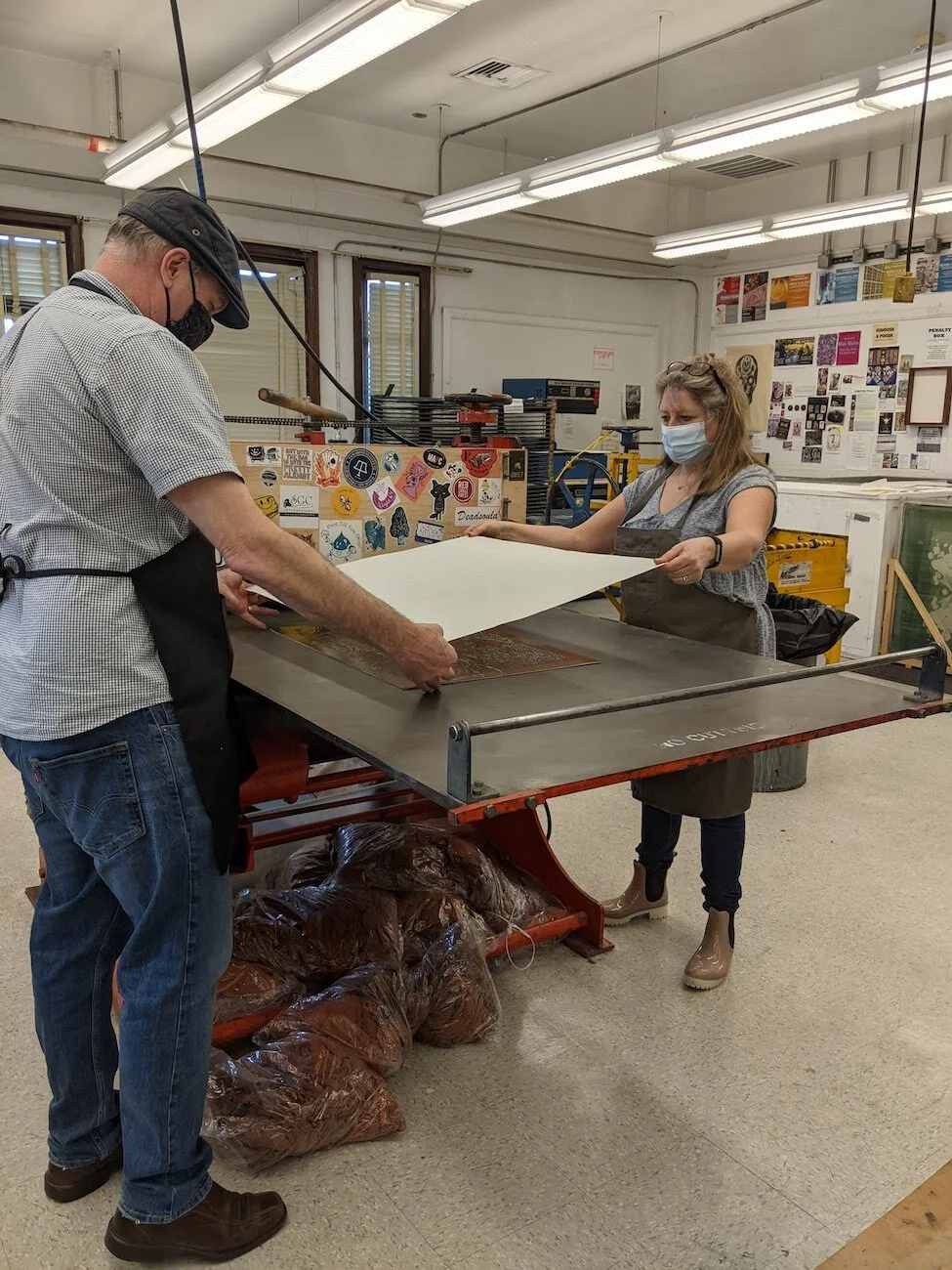 There are a variety of print presses in the studio which Jim goes over with the class. Setting up your block and substrate is virtually the same for all the presses, but how they operate varies. He demonstrates how to adjust the pressure and how to activate the presses. He also explains other things to be aware of, such as, safety precautions, what the different sounds mean, and troubleshooting. Towards the end of the demonstration, Jim prints some samples with the press as a refresher for all the steps and to show the students how to work with the press in a real situation. I thought this was particularly helpful because explaining is very different from showing. During one print, the block wasn’t able to pass through the roller, so Jim showed how to adjust the machine and try again. We can’t always be prepared for these kinds of situations, so seeing how to handle such issues is beneficial for the class.