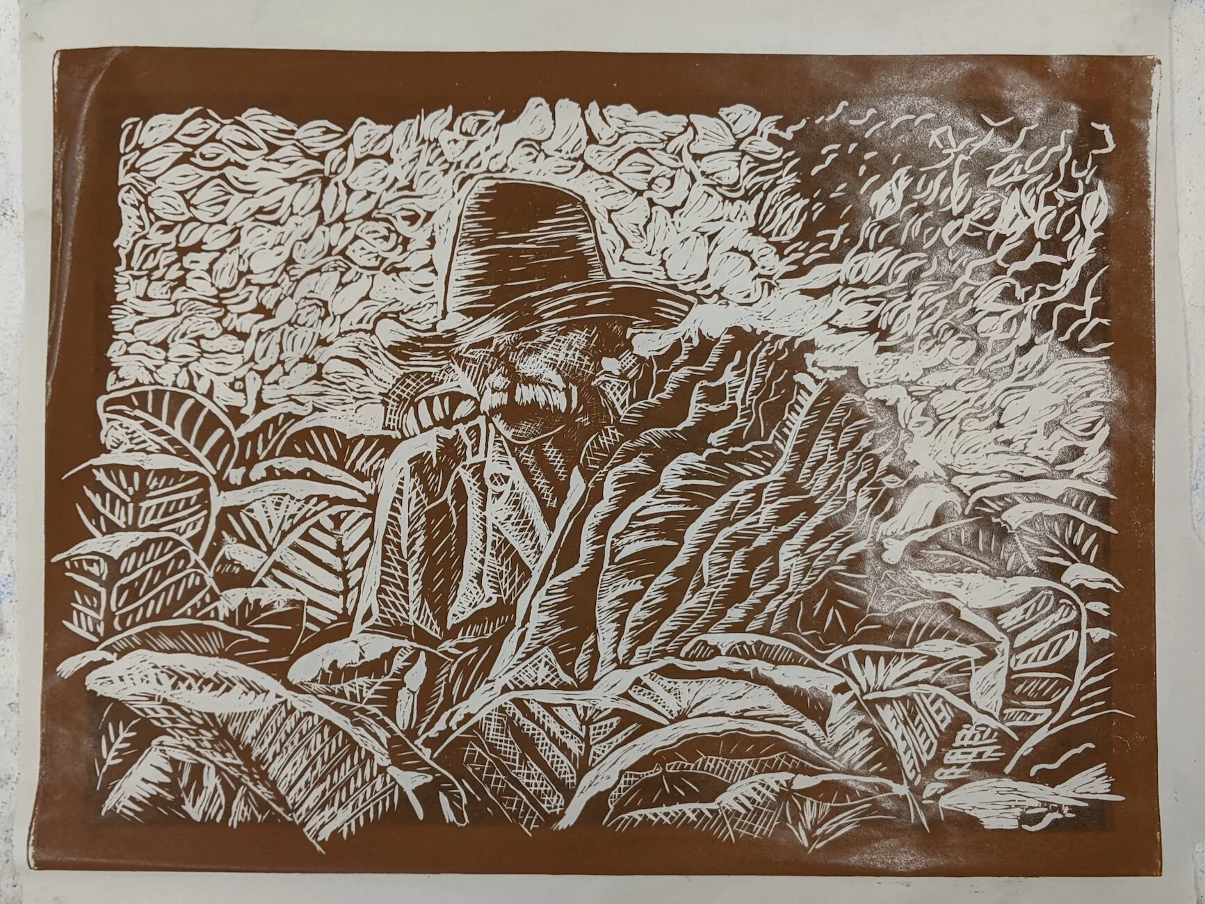 Jim pins some prints by Reinaldo Gil Zambrano who will be joining the class through Zoom on Monday. They are quite large and he points out that they were printed using a woodblock or MDF board.
