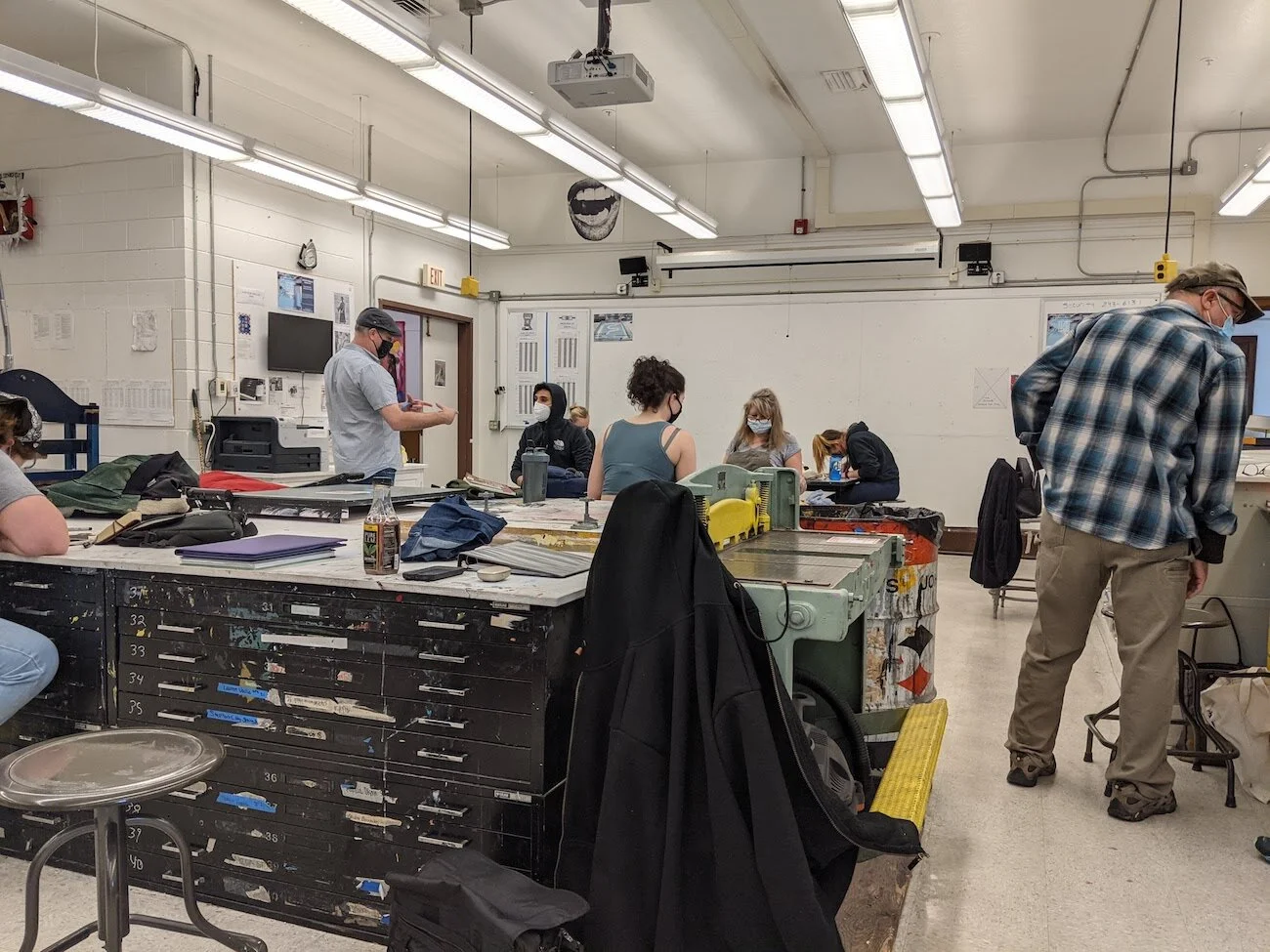 Other students ventured out on their own to try new experiences. One student attempted to sharpen carving tools for the first time. Another student used the small print press, which is manually operated rather than using the familiar electric press.