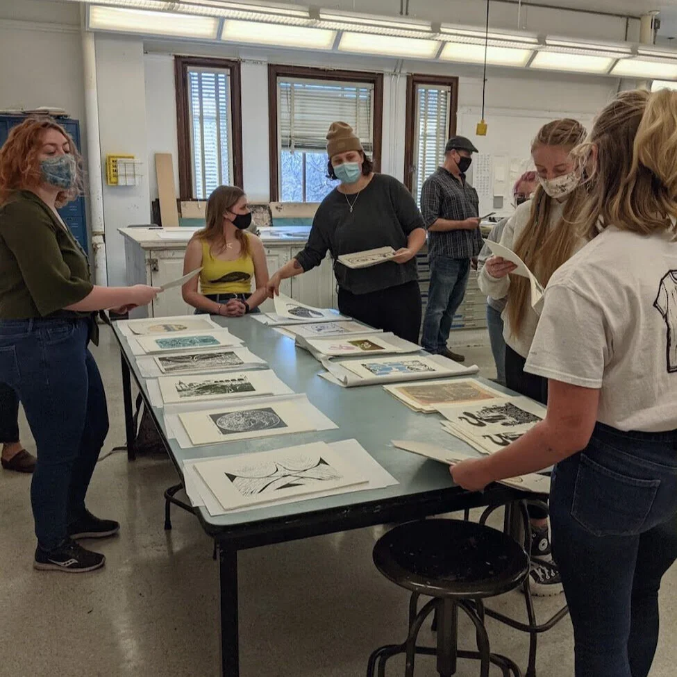 Students look at each other’s prints and discuss techniques including hand-printing.