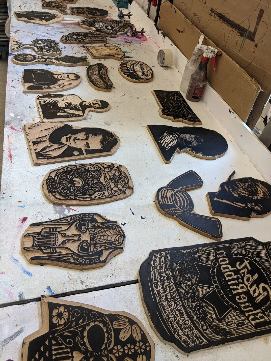 The class now has the option to participate in T-shirt woodblock printing. Jim and Jason prepare by laying out the various blocks, ink, and calibrating the presses. There is a variety of designs including the state of Montana, Bigfoot, Day of the Dead Star Wars figures, fish, Salvador Dali, a T-shirt, teeth, and more. The students are also allowed to use their previous blocks to print on T-shirts. Most of the class participates, while the rest leave early.