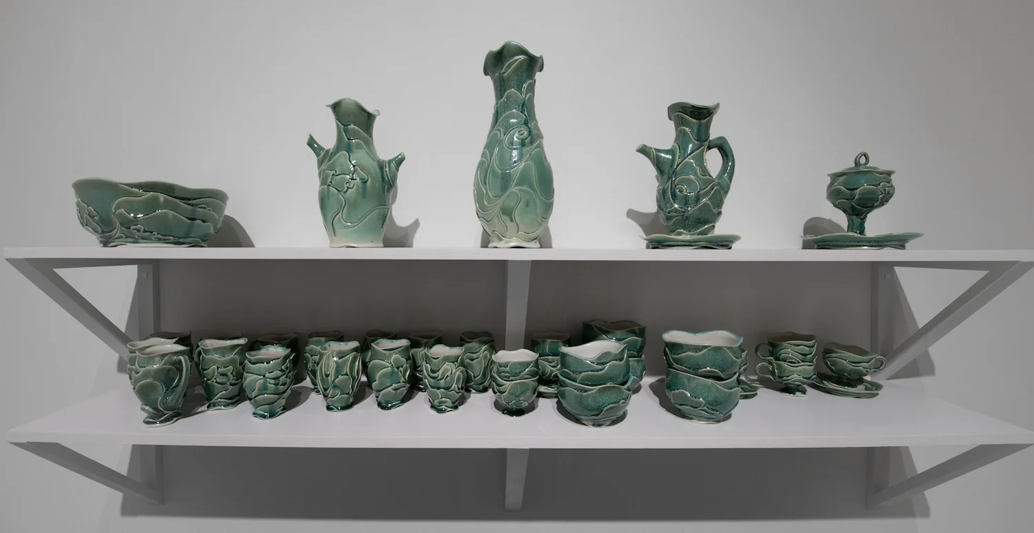 Porcelain, table, shelving, lilies / table 2.5 x 4 x 4 ft / shelving 1 x 1 x 6 ft / 2015