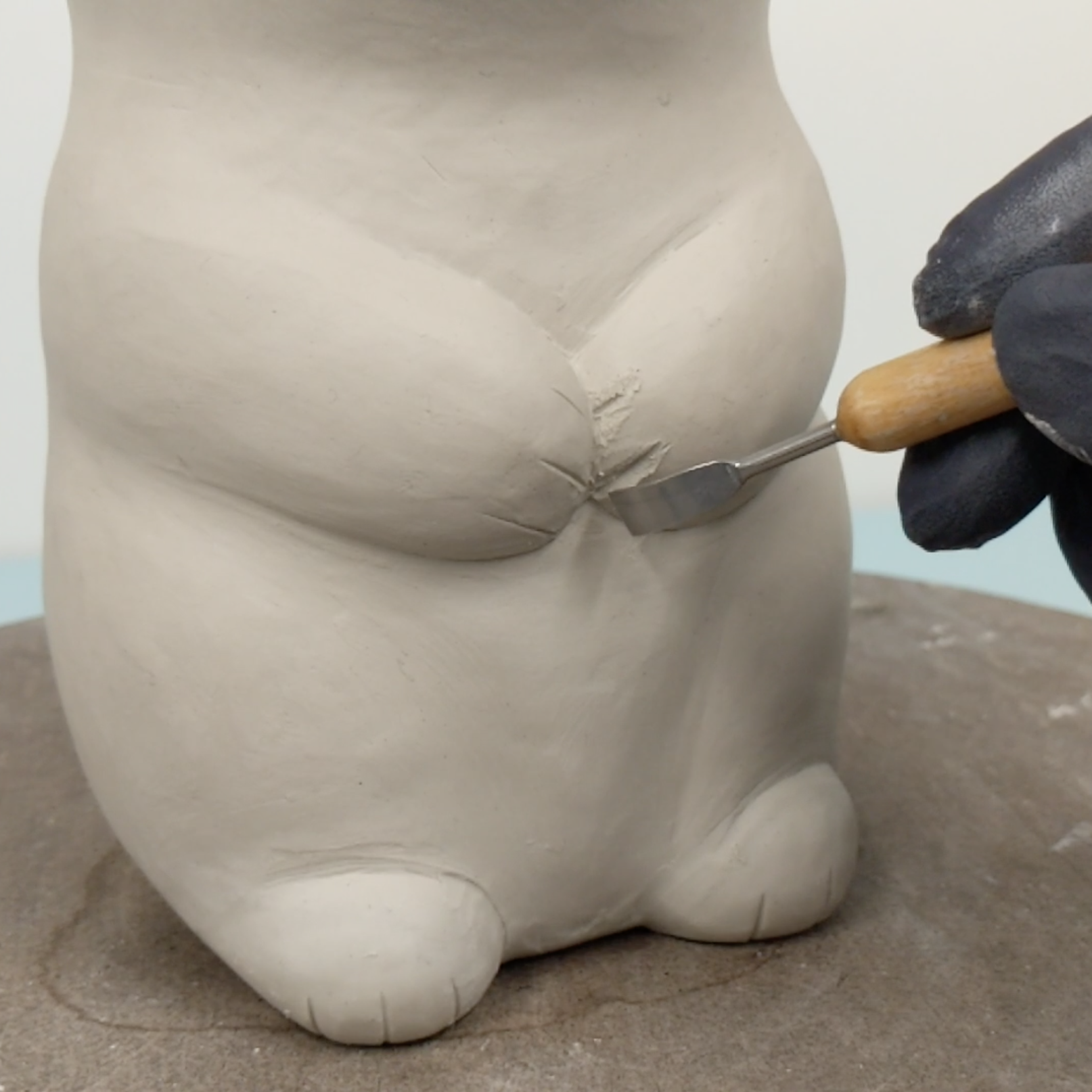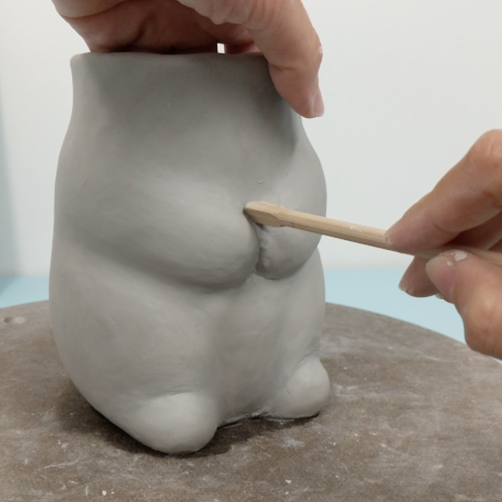 For parts that may protrude beyond what the clay can stretch to, you can add as pinched parts. For the feet, I shape these as tear drop pinch pots, marking where they will be placed, and then cutting out the wall just inside those markings to attach. I will also do this for the tail, but with a round pinch pot.