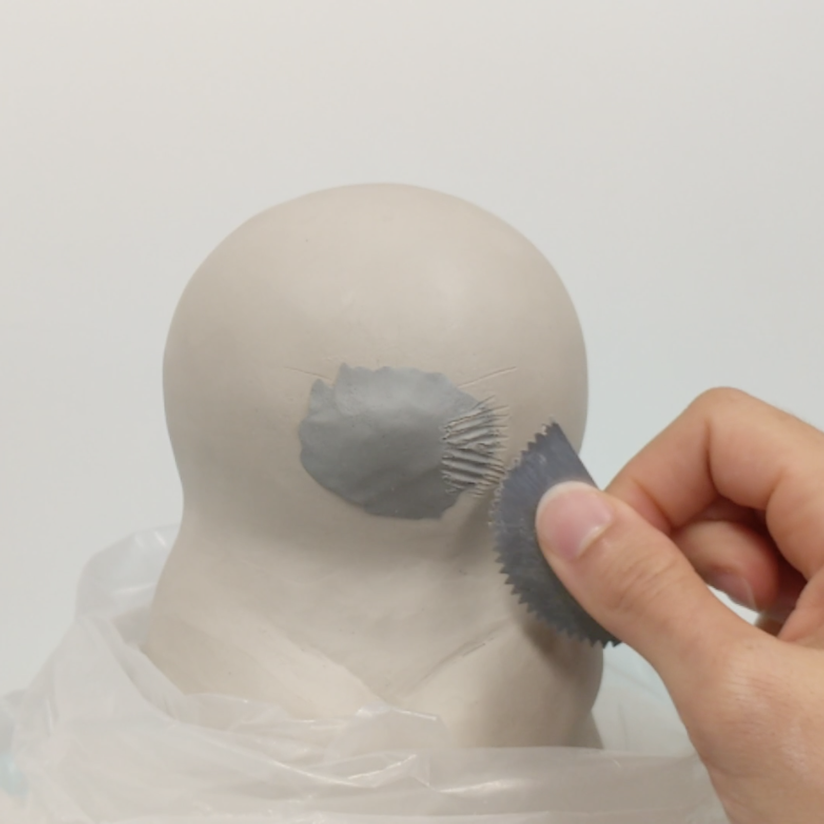 Alternatively, if you have a finger-sized hole to close up on the head, you can shape a bit of clay into a mushroom-shaped plug. The “stem” of the mushroom should fit snugly into the hole. I add a a tiny amount of water to make the surfaces sticky, then plug the hole. You can then smear the mushroom “cap” outward to blend it into the head.