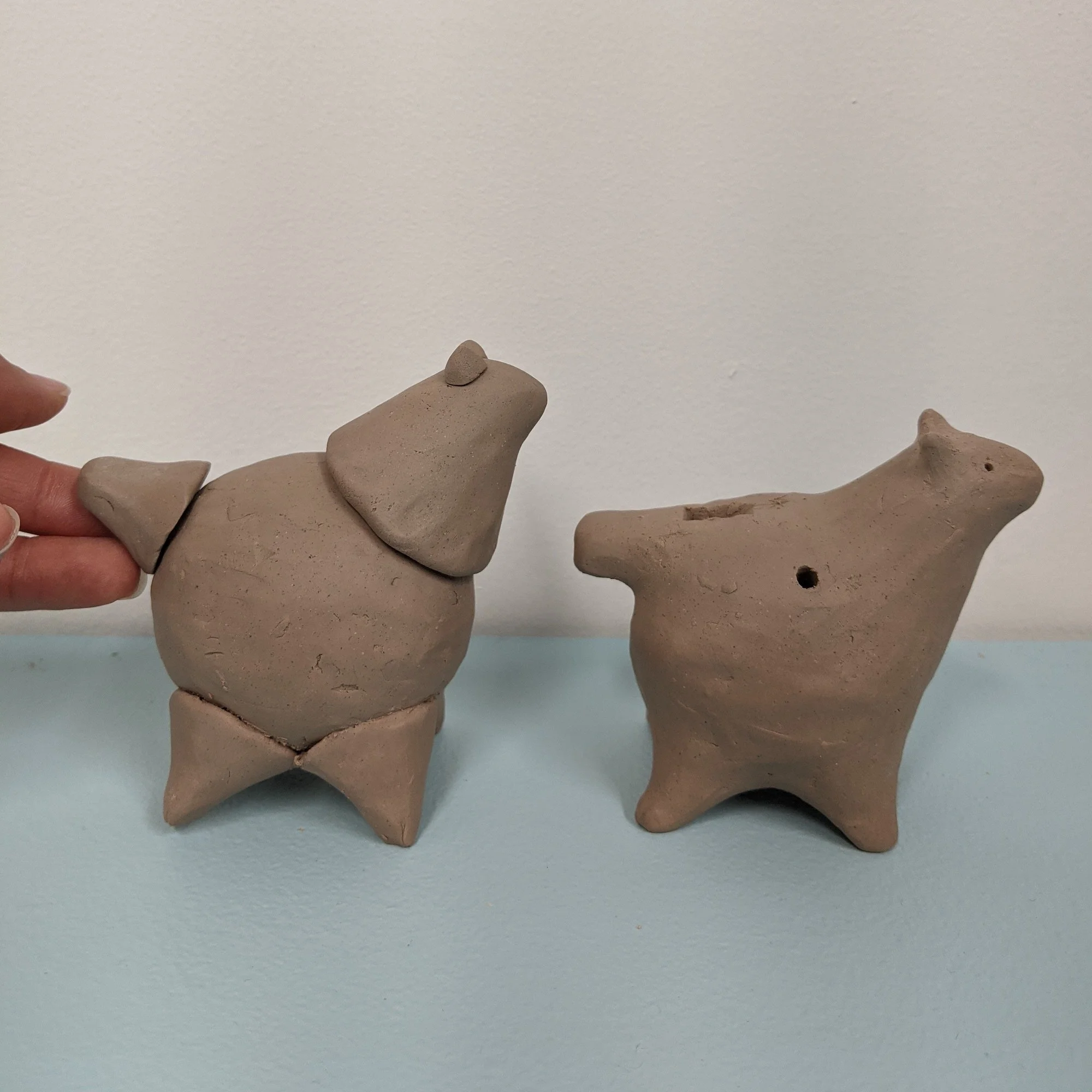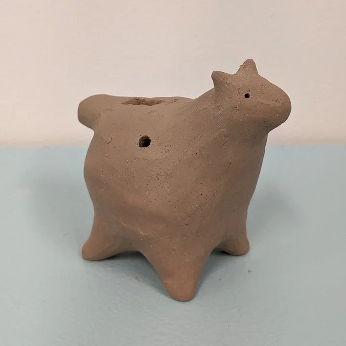 You can create whistles of various shapes and sizes, such as this creature just using shapes pinched parts. I like to make the heads of my animals whistles hollow, so I poke air holes where the eyes will be in order to not disturb the whistle air cavity.