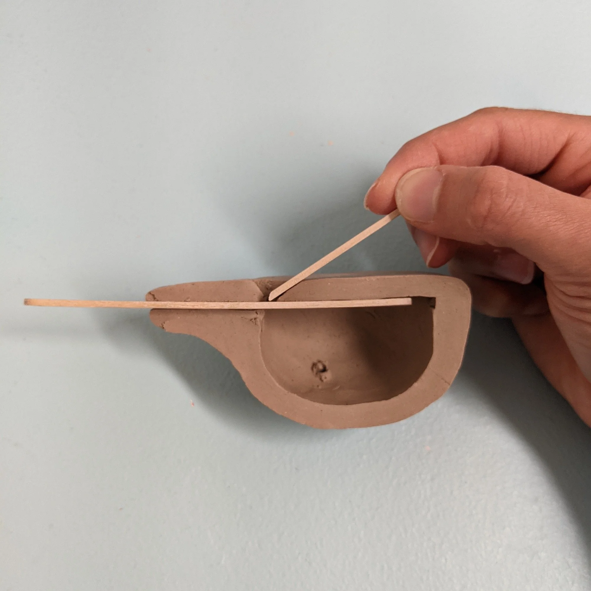 Insert a popsicle stick through the wedge mouth piece, piercing into the pinch pot cavity. It should be in line with the flat slab part. The popsicle stick ensures that the air passage flows straight into the fipple.
